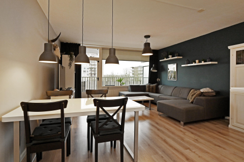 Indeling: Entree/hal met kast met Vaillant Ecotec Plus HR cv-combi installatie en mechanische ventilatie unit en meterkast (6 groepen, 3x aardlekschakelaar en hoofschakelaar). 2 Slaapkamers aan de galerijzijde. Deels betegelde toiletruimte met toilet en fonteintje. Geheel betegelde badkamer voorzien van douchecabine, wastafel met meubel, wasmachine- en drogeraansluiting. Woonkamer met toegang tot de loggia. Open keuken met rechte moderne keukenopstelling voorzien van spoelunit, vaatwasmachine, inductiekookplaat, vlakscherm afzuigkap, oven en koelkast met vriesvak. Het gehele appartement is voorzien van een laminaatvloer.